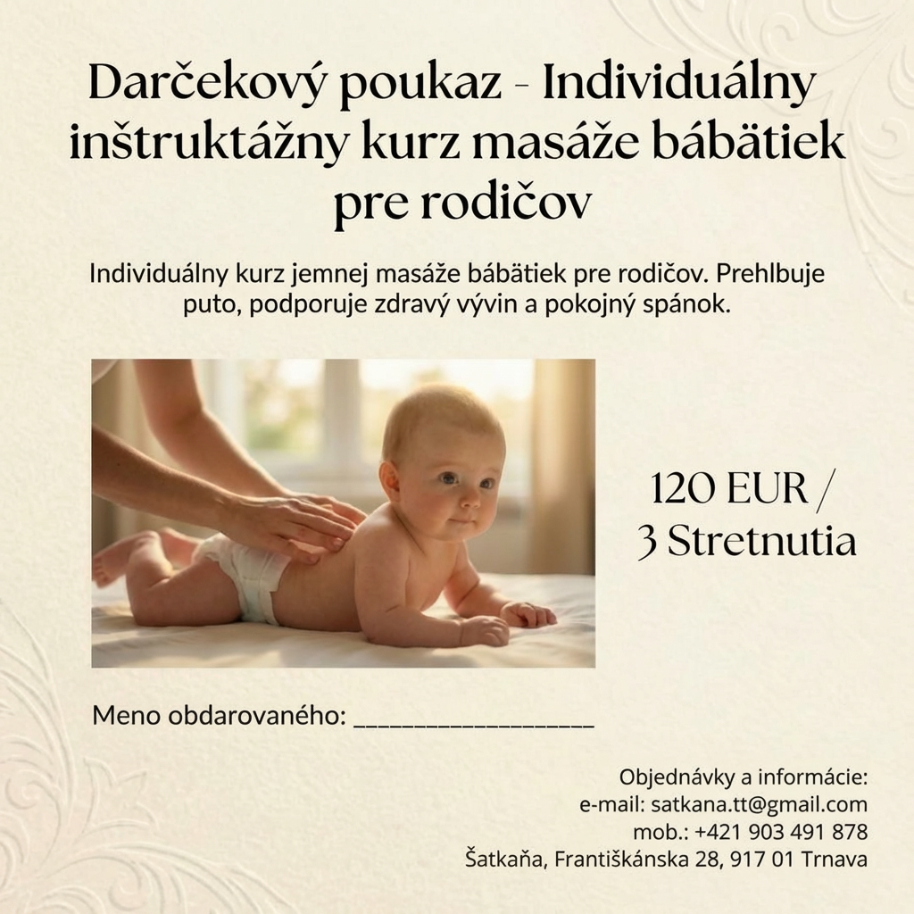 Hľadáte originálny a zmysluplný darček pre novopečených alebo budúcich rodičov? Darčekový poukaz na kurz masáže bábätiek je darček, ktorý im zostane navždy – nie ako hračka, ktorá skončí v kúte, ale ako cenná zručnosť, ktorú budú používať každý deň.