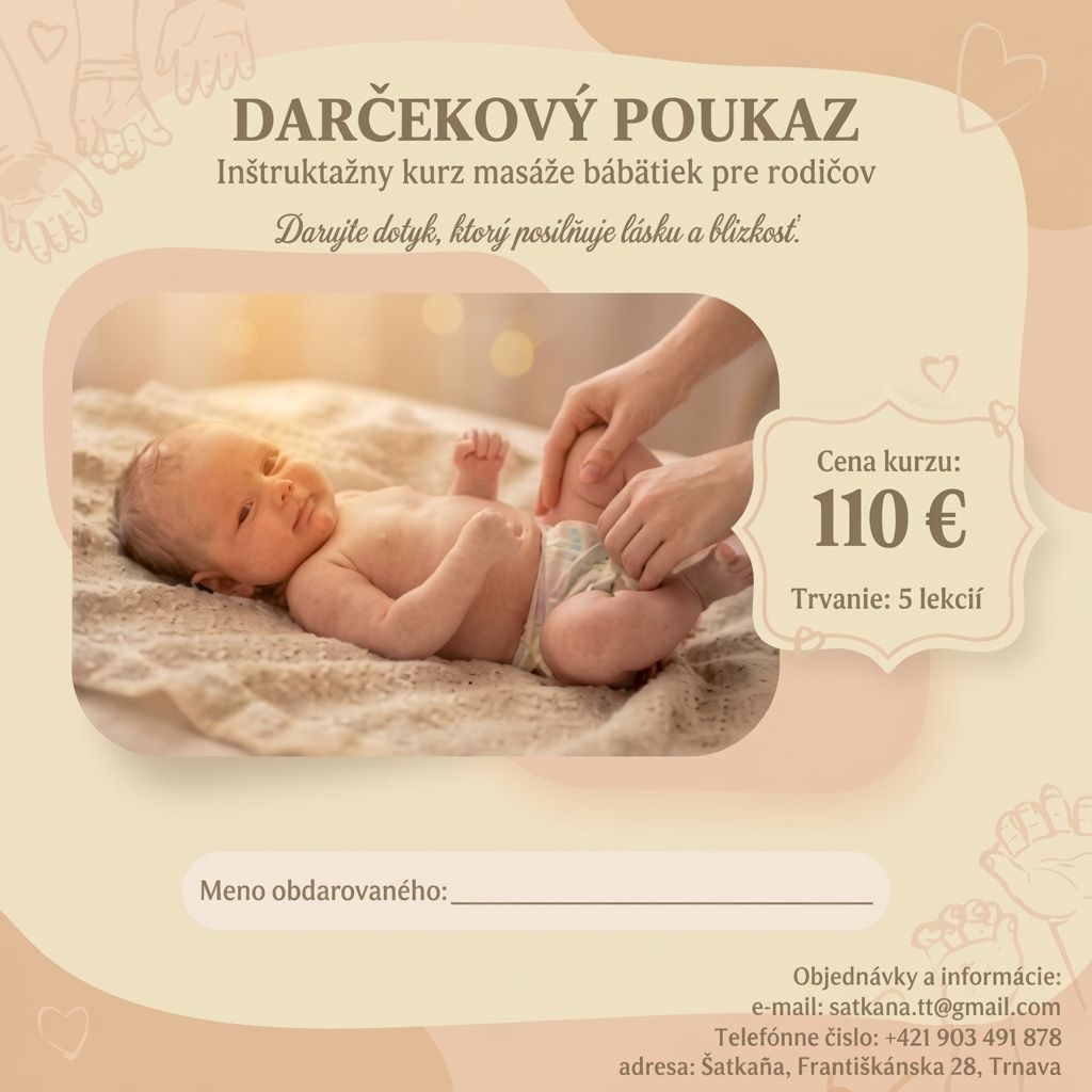 Hľadáte originálny a zmysluplný darček pre novopečených alebo budúcich rodičov? Darčekový poukaz na kurz masáže bábätiek je darček, ktorý im zostane navždy – nie ako hračka, ktorá skončí v kúte, ale ako cenná zručnosť, ktorú budú používať každý deň.