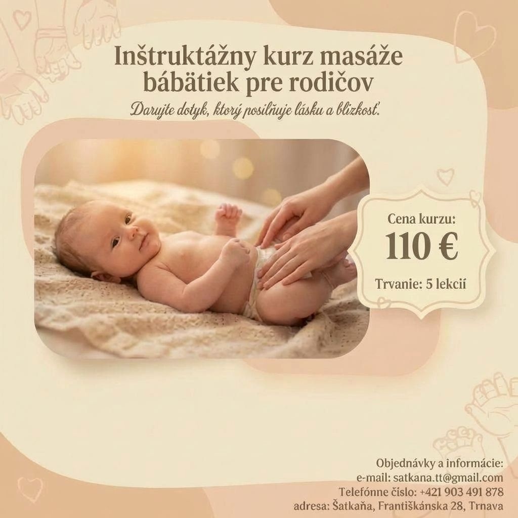 Na našom kurze sa naučíte praktické techniky, ktoré môžete používať každý deň – pred spaním, po kúpeli alebo kedykoľvek, keď vaše bábätko potrebuje upokojenie. Kurz vedie certifikovaná poradkyňa s dlhoročnými skúsenosťami v práci s rodinami a novorodencami.